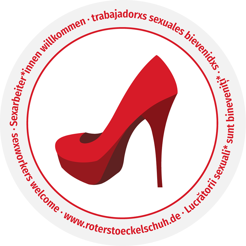 Ein Sticker des Projekts „Roter Stöckelschuh“ an der Tür einer Praxis signalisiert: Hier wird freundlich und kompetent mit Sexarbeiter*innen umgegangen. Hier muß niemand Angst vor Ablehnung wegen des Berufs haben. Hier kann sich ohne Gefahr als Sexarbeiter*in geoutet werden. Auf der Website www.roterstoeckelschuh.de können Sexarbeitende in einer wachsenden Datenbank sexarbeitsfreundliche Adressen recherchieren.